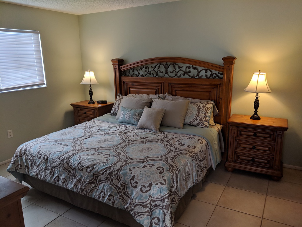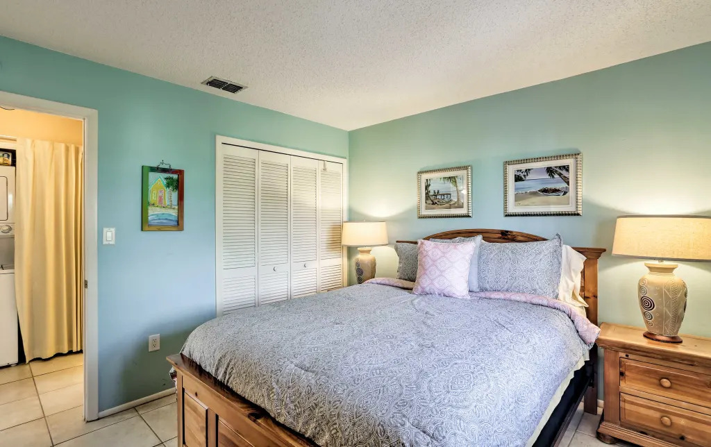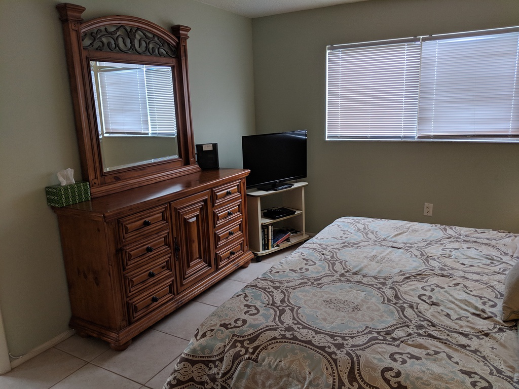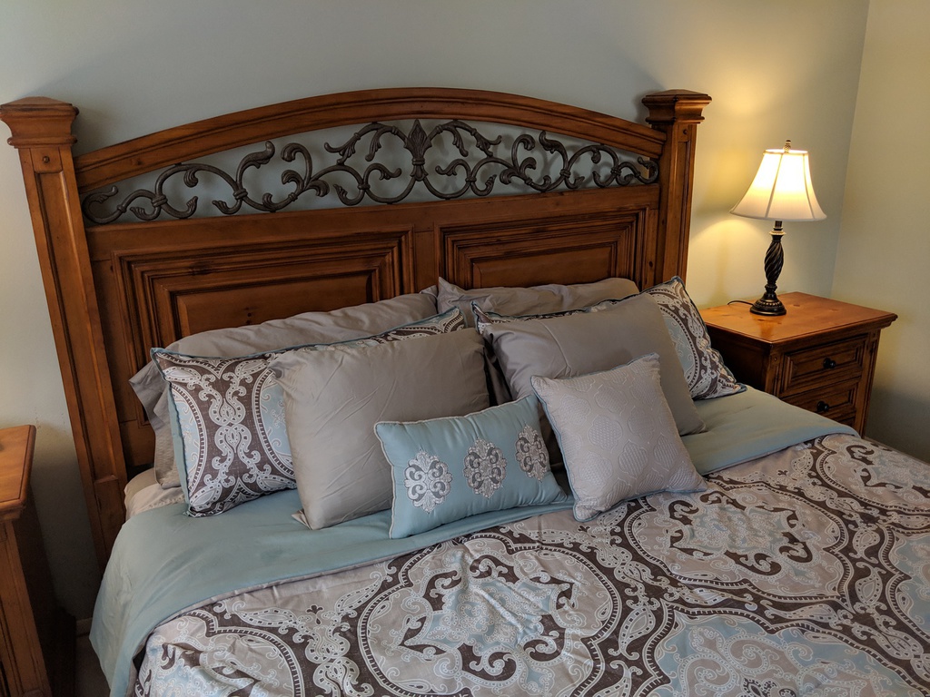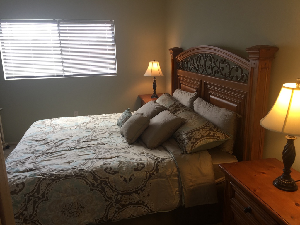 Guest Bedroom: Queen Bed, dresser w/mirror, 2 nightstands w/lamps, closet